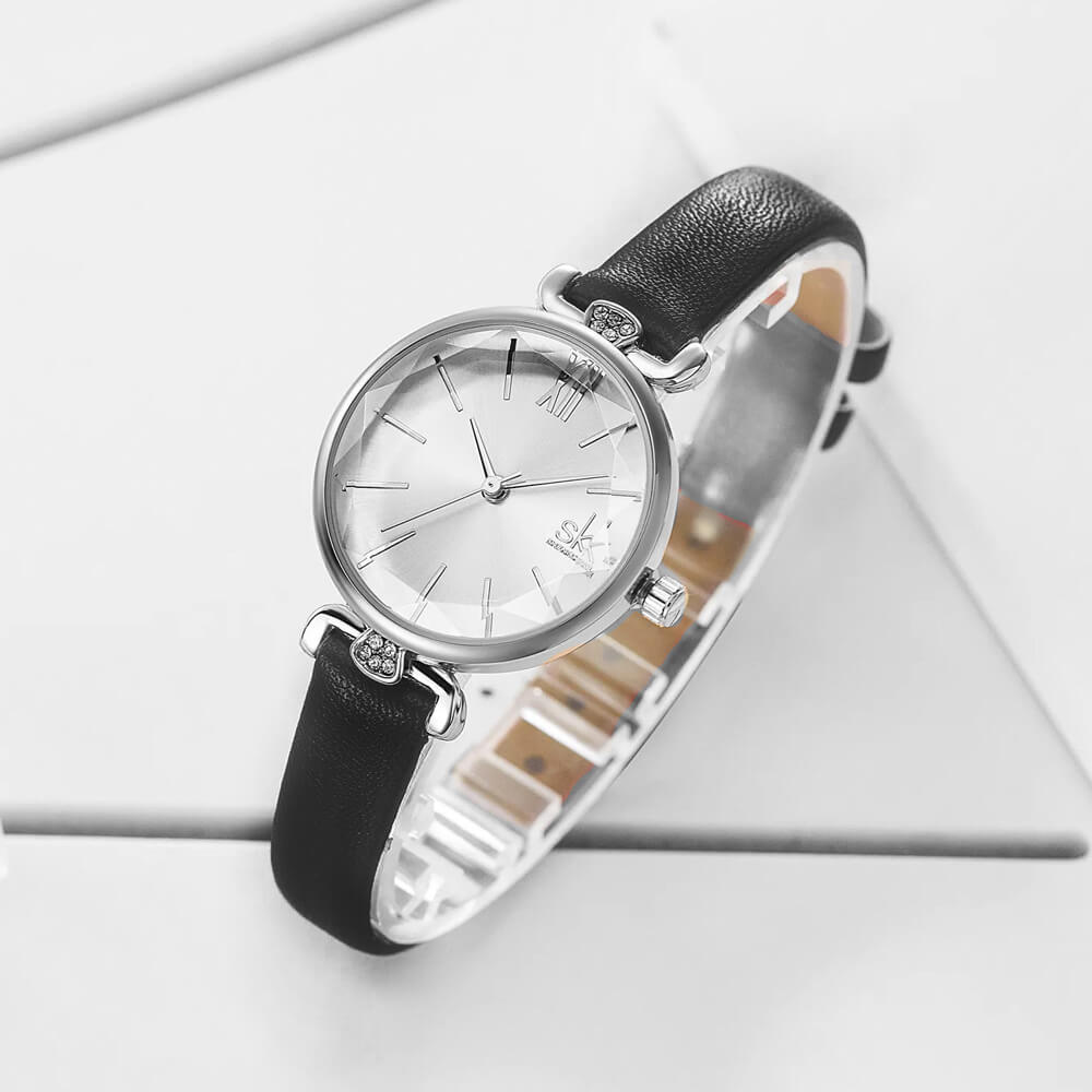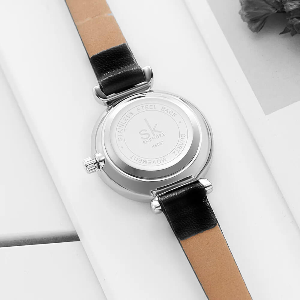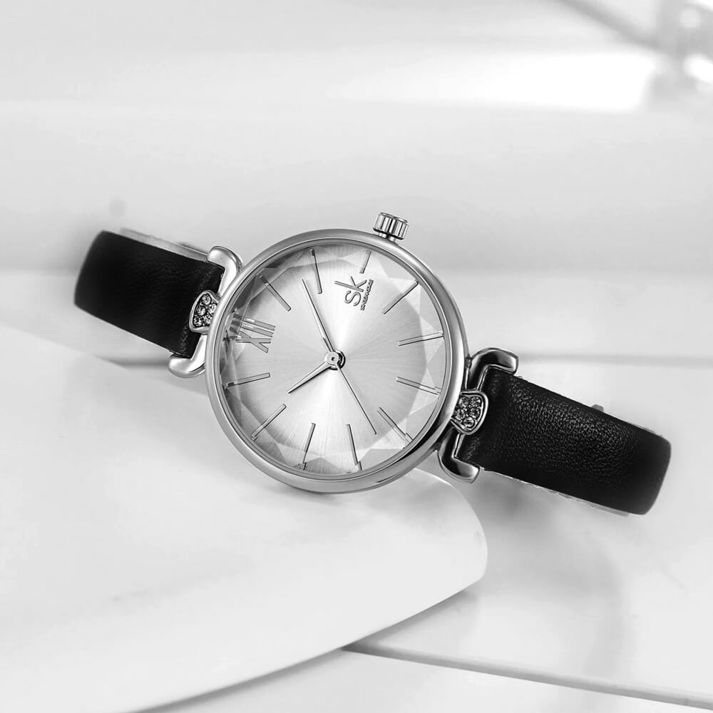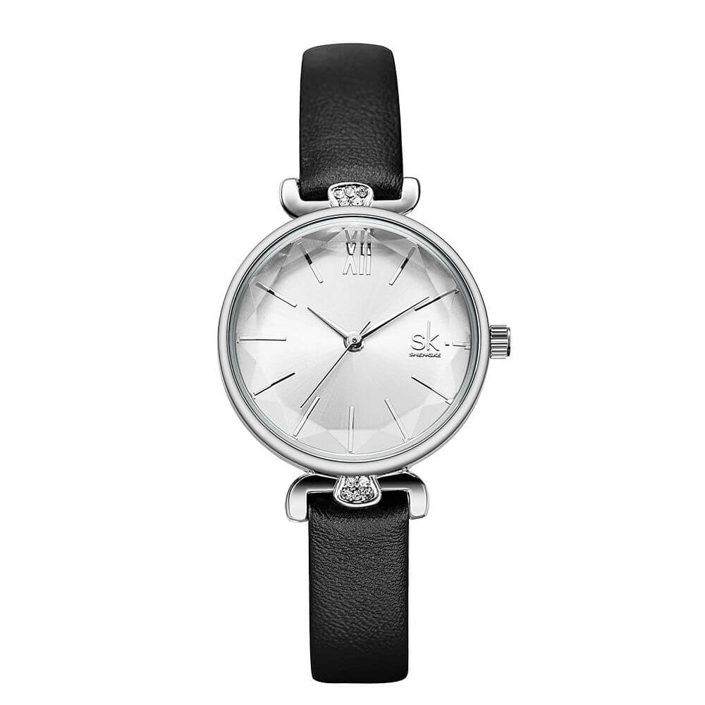 Fekete szíjas klasszikus Shengke női karóra. Ez a nőies karóra magában hordozza a romantikus elegancia finom szépségét. Az óratok tetején és alja apró kövekekl díszített. Az óraüveg széle gyémánt mintára hasonlító csiszolással készült. Szintetikus fekete bőrszíj, fémes számlap, valamint ezüst színű óratok. Ez az óra nem csak időmérő, hanem egy érzés is: egyszerre klasszikus, romantikus és lágyan nőies, tökéletes választás, ha szeretnéd viselni a hétköznapokban és különleges alkalmakon egyaránt.